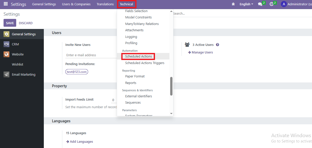 To access the scheduled action responsible for auto-sending matched properties, go to Settings, then navigate to Technical, and click on Scheduled Actions.